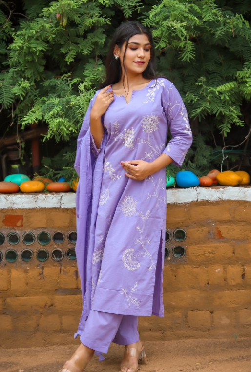 The serene light blue shade adorned with delicate floral embroidery adds a graceful, feminine charm that makes this outfit effortlessly chic. It whispers of calm and luxury.